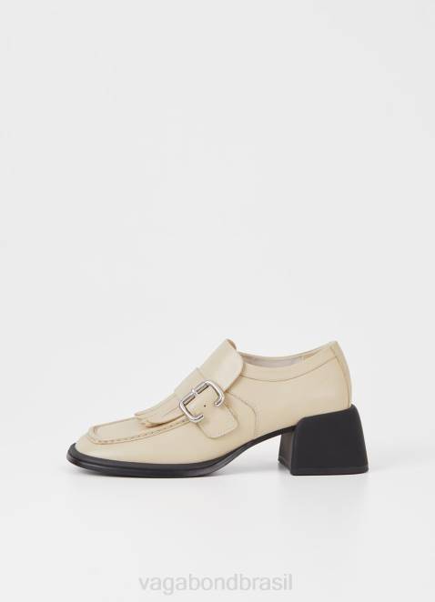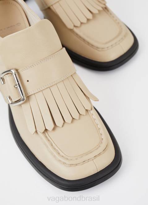 ansie é o mocassim com franjas e salto com visual contemporâneo. o estilo é feito em couro off-white com bico arredondado, franjas decorativas e detalhe de fivela prateada na parte superior. o salto bloco largo mede 59mm.