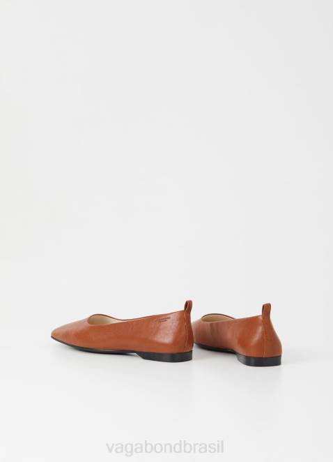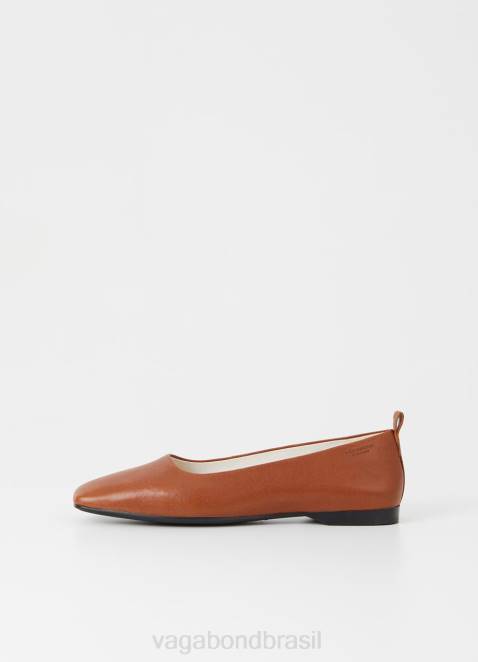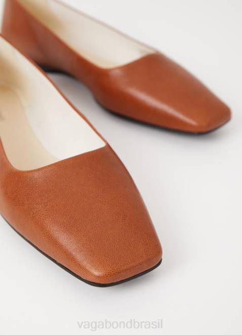 a Timeless Flats Delia tem um design sofisticado e minimalista. a parte superior formal é trabalhada em couro conhaque, projetada com dedos quadrados e presilhas no calcanhar. o estilo assenta em solas finas com saltos de 12 mm.
