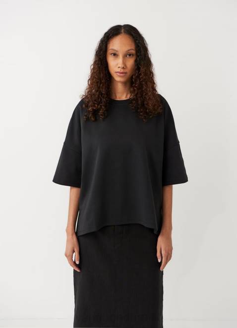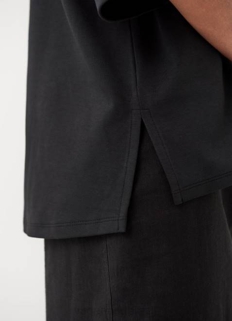 a t-shirt boxy é confeccionada em jérsei pesado de algodão orgânico com um corte relaxado, com uma frente ligeiramente cortada e costas caídas com gola redonda, ombros descaídos e aberturas laterais.